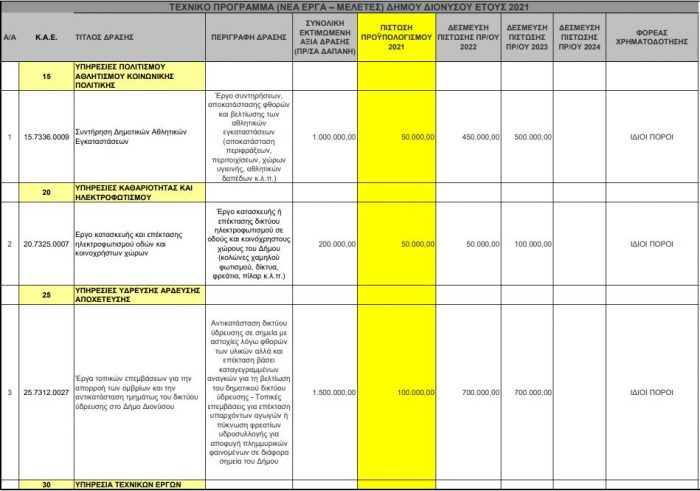 Εγκρίθηκε το Τεχνικό Πρόγραμμα 2021 του Δήμου Διονύσου