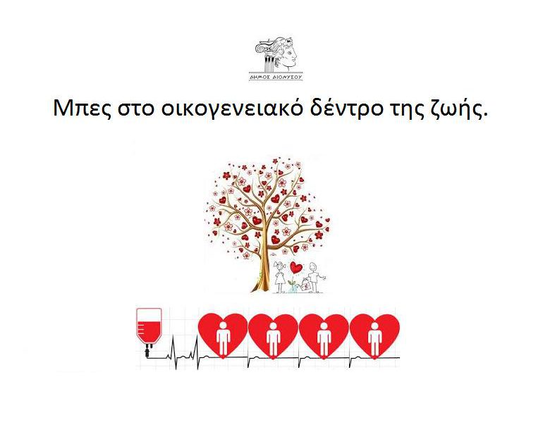 Ο Δήμος Διονύσου ανταποκρινόμενος στην έκκληση των νοσοκομείων της χώρας για αίμα διοργανώνει έκτακτη Εθελοντική Αιμοδοσία και καλεί τους υγιείς δημότες του, την Τρίτη 7 Απριλίου 2020, στο Πολιτιστικό Κέντρο Αγίου Στεφάνου (Πεντζερίδη 3) από τις 15:00 μ.μ. έως τις 19:30 μ.μ. να στηρίξουν την προσπάθειά αυτή προκειμένου να βοηθήσουμε, όλοι μαζί, να διασφαλιστεί η επάρκεια της χώρας σε αίμα.