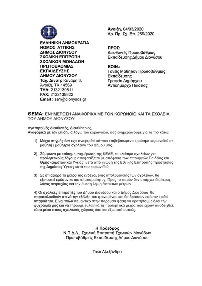 Ενημερωτική επιστολή Σχολικών επιτροπών του Δήμου Διονύσου για τον κορωνοϊό