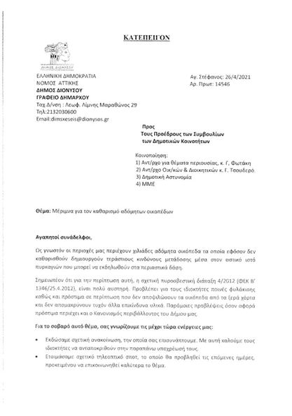 Επιστολή του Δημάρχου Διονύσου προς τους Προέδρους των Δημοτικών Κοινοτήτων για τα αδόμητα οικόπεδα