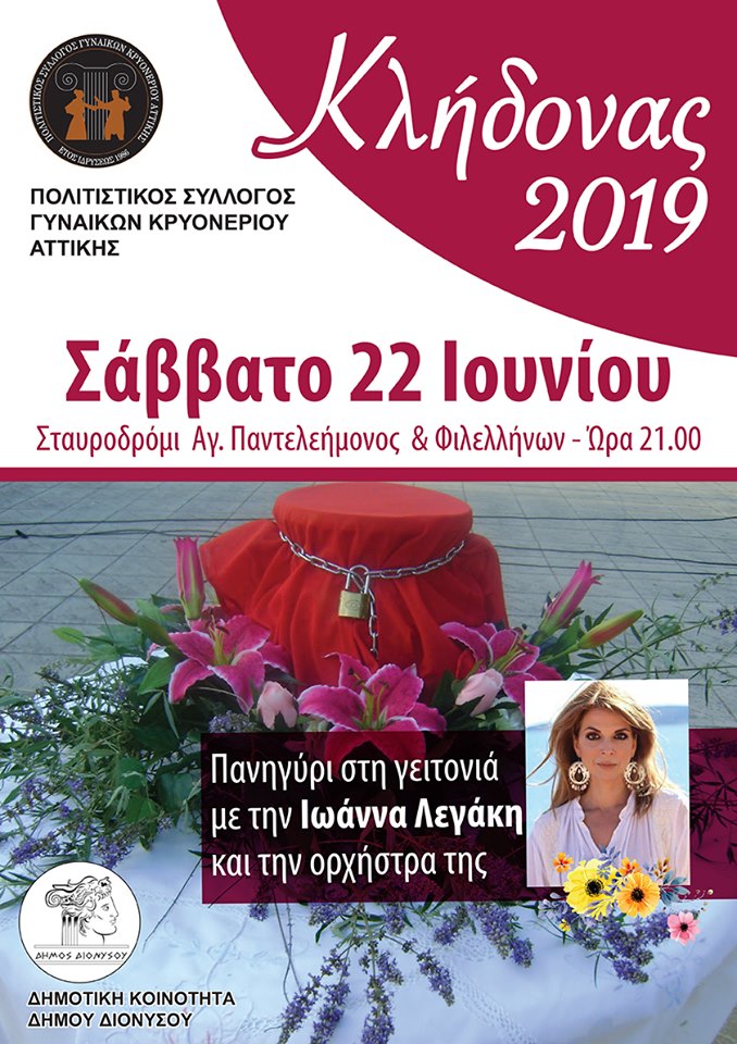 – Σάββατο 22 Ιουνίου ώρα 21:00 ‘Κλήδονας” με την Ιωάννα Λεγάκη και την ορχήστρα της στο σταυροδρόμι Αγ. Παντελεήμονος και Φιλελλήνων.