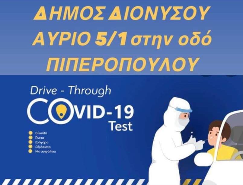 Νέος Δωρεάν έλεγχος ταχείας ανίχνευσης Covid-19 Δήμου Διονύσου, αύριο Τρίτη 5/1/2021 στη Λ. Πιπεροπούλου