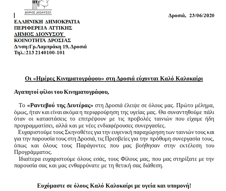 Οι «Ημέρες Κινηματογράφου» στη Δροσιά εύχονται Καλό Καλοκαίρι