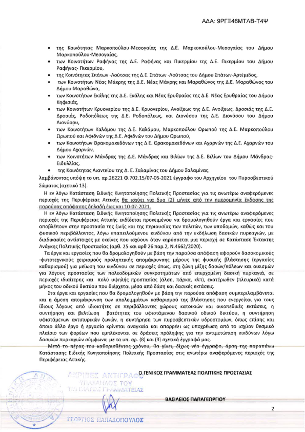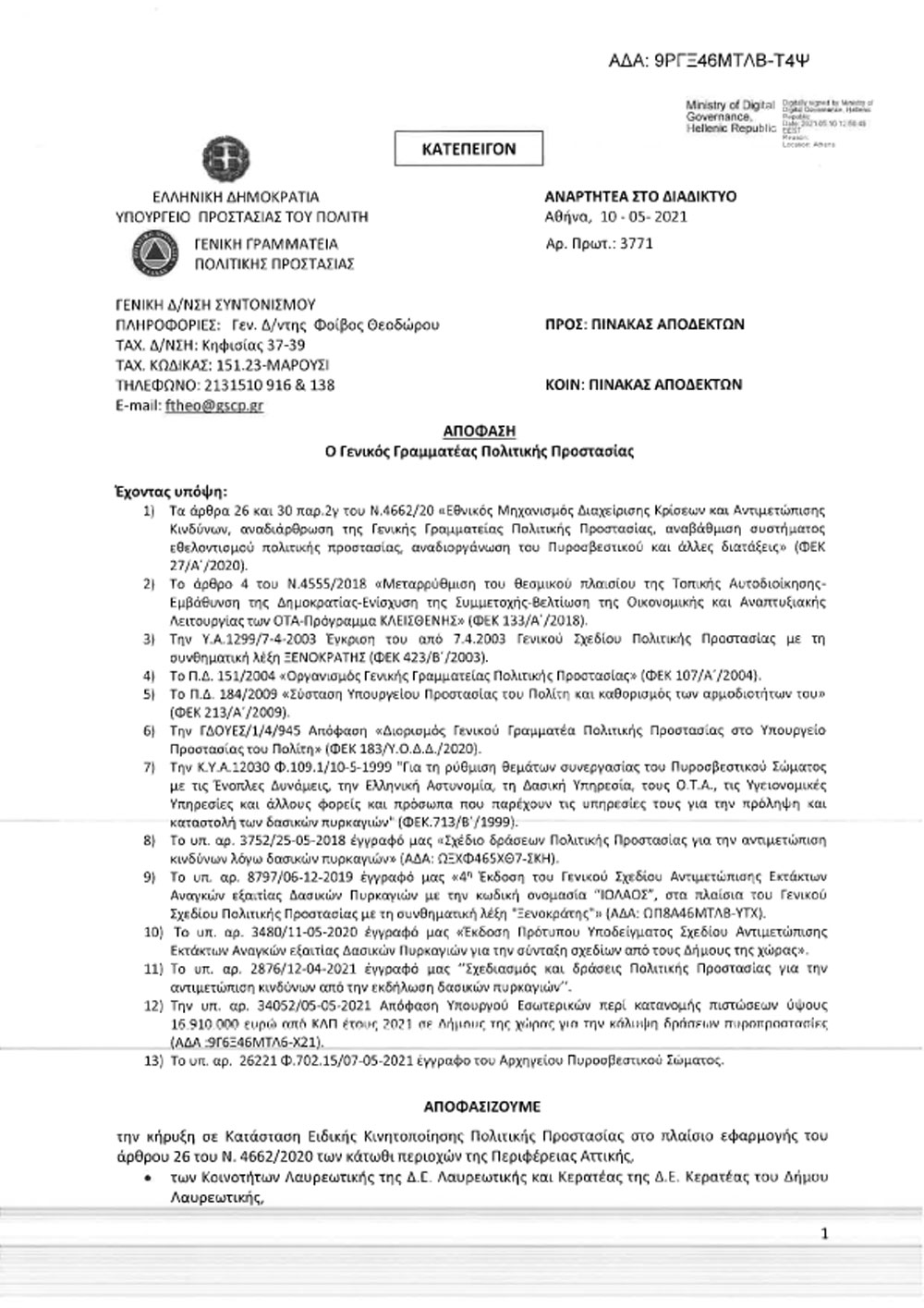 Ο Γενικός Γραμματέας Πολιτικής Προστασίας με την Απόφασή του με Α.Π.: 3771/10.5.2021 κήρυξε σε κατάσταση Ειδικής Κινητοποίησης Πολιτικής Προστασίας 5 Δημοτικές Κοινότητες του Δήμου Διονύσου, και συγκεκριμένα τις ΔΚ Άνοιξης, Δροσιάς, Διονύσου, Κρυονερίου και Ροδόπολης, σύμφωνα με το Άρθρο 26 του Νόμου 4662/2020.