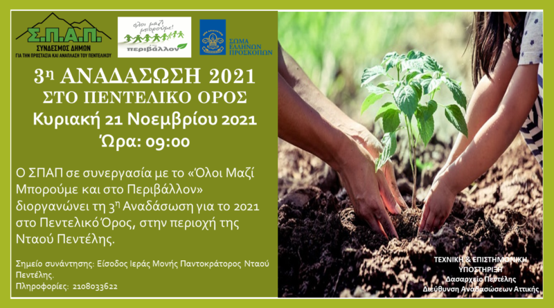 Ο Σύνδεσμος Δήμων για την Προστασία και Ανάπλαση του Πεντελικού (ΣΠΑΠ) συνεχίζει δυναμικά τις δράσεις αναδάσωσης βοηθώντας με τον καλύτερο δυνατό τρόπο στην ανάπλαση και αποκατάσταση του φυσικού περιβάλλοντος στο Πεντελικό Όρος. Ο Σύνδεσμος για την Προστασία και Ανάπλαση του Πεντελικού (ΣΠΑΠ) σε συνεργασία με το «Όλοι Μαζί Μπορούμε και στο Περιβάλλον», διοργανώνει την 3η δράση Αναδάσωσης που θα πραγματοποιηθεί την Κυριακή 21 Νοεμβρίου 2021 στις 09 π.μ. στην περιοχή της Νταού Πεντέλης.