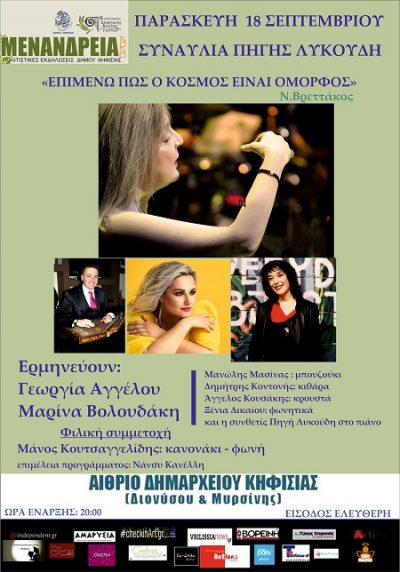 Αλλαγή ημερομηνίας μουσικής βραδιάς «Επιμένω πως ο κόσμος είναι όμορφος» με την Πηγή Λυκούδη