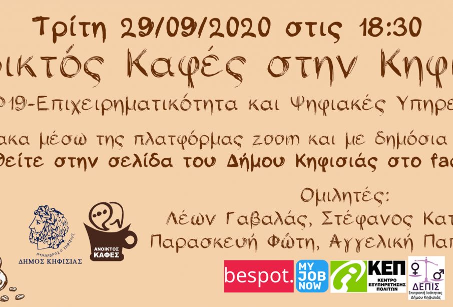 Οι δράσεις επιχειρηματικότητας με πρωτοβουλία του Δημάρχου Κηφισιάς κ.Γιώργου Θωμάκου και εποπτεία της αρμόδιας Αντιδημάρχου κας. Νίνας (Ασπασίας) Βλάχου, «Ανοικτός Καφές στην Κηφισιά: Ιστορίες Επιχειρηματικής Επιτυχίας» επανέρχονται την Τρίτη 29 Σεπτεμβρίου στις 18:30 με ένα επίκαιρο θέμα COVID 19-Επιχειρηματικότητα και Ψηφιακές Υπηρεσίες. Η συγκεκριμένη δράση θα εστιάσει στο πως η πανδημία του κορονοϊού αλλάζει οικονομία, εργασία, επιχειρήσεις και τοπικές κοινωνίες. Η δράση θα πραγματοποιηθεί διαδικτυακά μέσω της πλατφόρμας zoom, με ταυτόχρονη δημόσια προβολή στη σελίδα του Δήμου Κηφισιάς στο facebook, με δυνατότητα υποβολής παρατηρήσεων και ερωτημάτων.