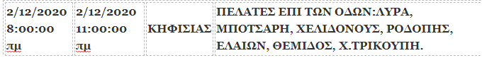 | 2/12/2020 8:00:00 πμ | 2/12/2020 11:00:00 πμ | ΚΗΦΙΣΙΑΣ | ΠΕΛΑΤΕΣ ΕΠΙ ΤΩΝ ΟΔΩΝ:ΛΥΡΑ, ΜΠΟΤΣΑΡΗ, ΧΕΛΙΔΟΝΟΥΣ, ΡΟΔΟΠΗΣ, ΕΛΑΙΩΝ, ΘΕΜΙΔΟΣ, Χ.ΤΡΙΚΟΥΠΗ. | 842 | Κατασκευές |
