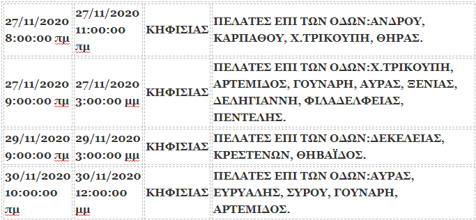 Προγραμματισμένες διακοπές ρεύματος στον Δήμο Κηφισιάς την Παρασκευή 27/11, την Κυριακή 29/11 και την Δευτέρα 30/11 στον Δήμο Κηφισιάς όπως ανακοίνωσε η ΔΕΔΔΗΕ.
