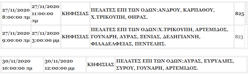 Προγραμματισμένες διακοπές ρεύματος στον Δήμο Κηφισιάς την Παρασκευή 27/11 και την Δευτέρα 30/11 στον Δήμο Κηφισιάς όπως ανακοίνωσε η ΔΕΔΔΗΕ.