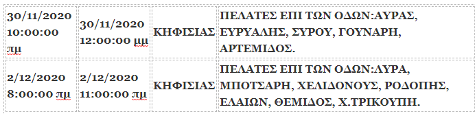 | 30/11/2020 10:00:00 πμ | 30/11/2020 12:00:00 μμ | ΚΗΦΙΣΙΑΣ | ΠΕΛΑΤΕΣ ΕΠΙ ΤΩΝ ΟΔΩΝ:ΑΥΡΑΣ, ΕΥΡΥΑΛΗΣ, ΣΥΡΟΥ, ΓΟΥΝΑΡΗ, ΑΡΤΕΜΙΔΟΣ. | 830 | Συντήρηση |