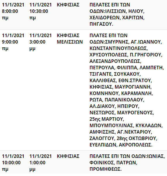 | 11/1/2021 8:00:00 πμ | 11/1/2021 10:30:00 πμ | ΚΗΦΙΣΙΑΣ | ΠΕΛΑΤΕΣ ΕΠΙ ΤΩΝ ΟΔΩΝ:ΙΛΙΣΣΙΩΝ, ΗΛΙΟΥ, ΧΕΛΙΔΟΡΕΩΝ, ΧΑΡΙΤΩΝ, ΠΗΓΑΣΟΥ. | 6 | Κατασκευές |