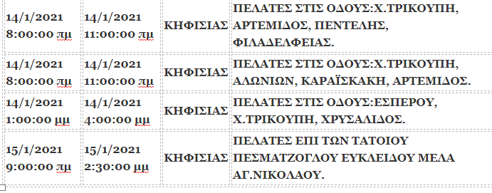 14/1/2021 8:00:00 πμ 14/1/2021 11:00:00 πμ ΚΗΦΙΣΙΑΣ ΠΕΛΑΤΕΣ ΣΤΙΣ ΟΔΟΥΣ:Χ.ΤΡΙΚΟΥΠΗ, ΑΡΤΕΜΙΔΟΣ, ΠΕΝΤΕΛΗΣ, ΦΙΛΑΔΕΛΦΕΙΑΣ. 22 Κατασκευές