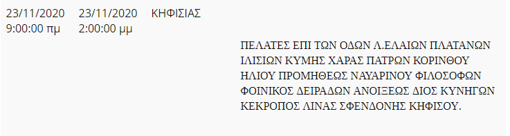 Προγραμματισμένες διακοπές ρεύματος στον Δήμο Κηφισιάς την Δευτέρα 23/11 στον Δήμο Κηφισιάς όπως ανακοίνωσε η ΔΕΔΔΗΕ.