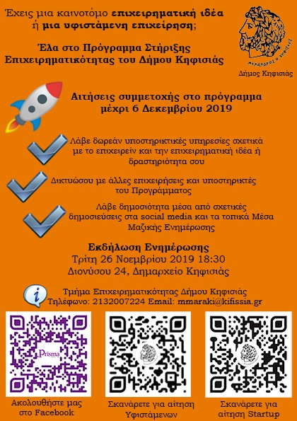 Την Τρίτη 26 Νοεμβρίου και ώρα 18:30 θα πραγματοποιηθεί η εκδήλωση έναρξης του προγράμματος Στήριξης Επιχειρηματικότητας του Δήμου Κηφισιάς, στην αίθουσα «Σταύρος Βόλκος» του Δημαρχείου Κηφισιάς.