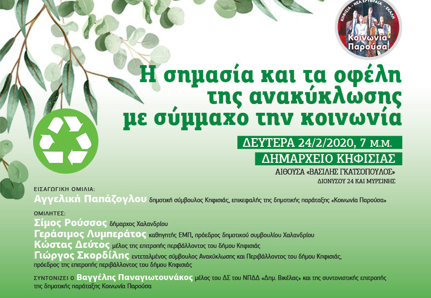 Εκδήλωση της “Κοινωνίας Παρούσα” για την ανακύκλωση στην Κηφισιά 24/2/20