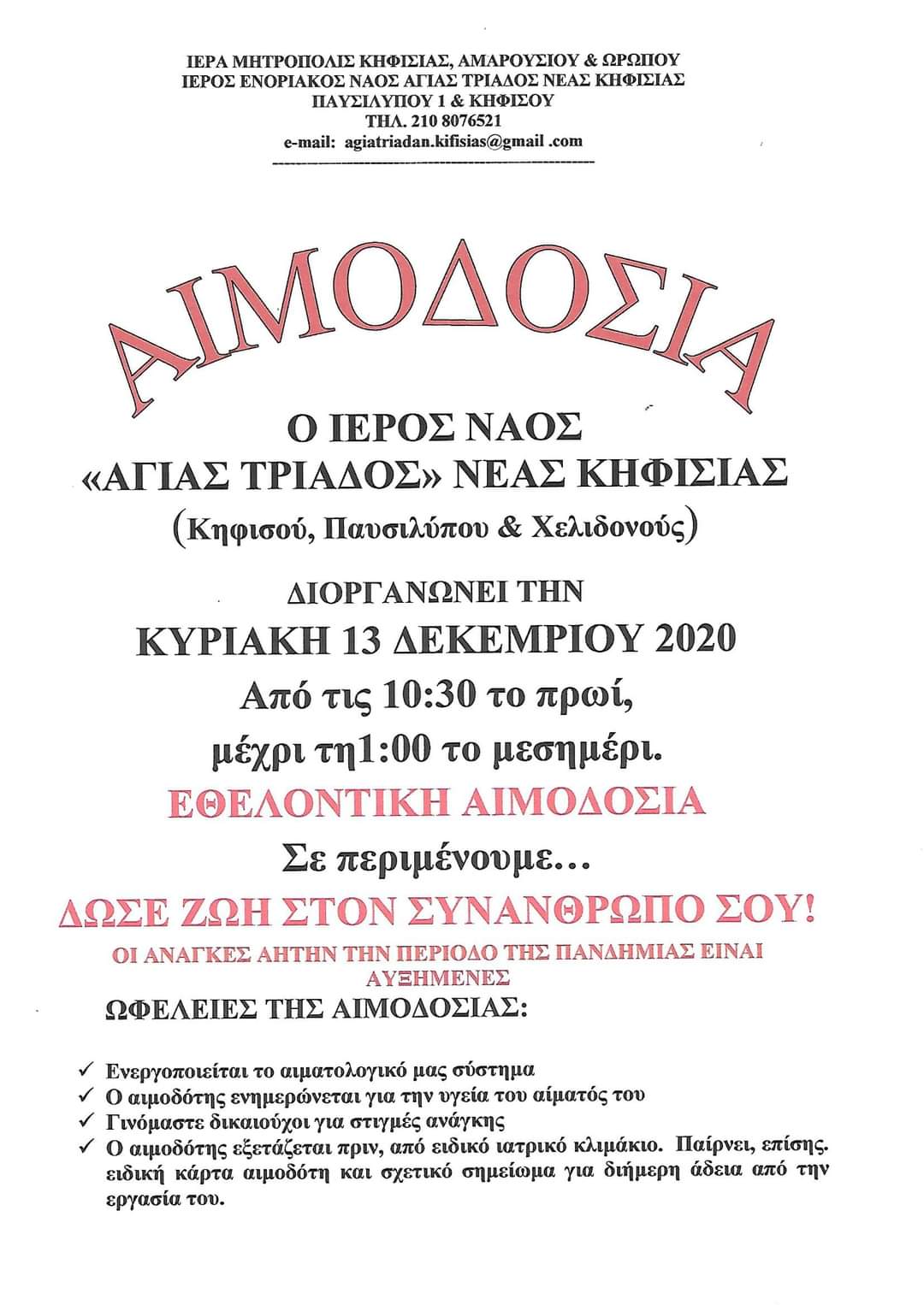 Εθελοντική αιμοδοσία από τον Ιερό Ναό Αγίας Τριάδος Ν. Κηφισιάς την Κυριακή 13/12