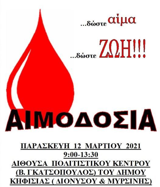 Η εθελοντική αιμοδοσία έχει προγραμματιστεί από το ΝΠΔΔ «Κοινωνική Μέριμνα» του Δήμου Κηφισιάς σε συνεργασία με το Λαϊκό Νοσοκομείο, για τη Παρασκευή 12 Μαρτίου 2021 και ώρες 9.00-13.30, στην Αίθουσα του Πολιτιστικού Κέντρου στο Δημαρχείο Κηφισιάς (Διονύσου& Μυρσίνης).