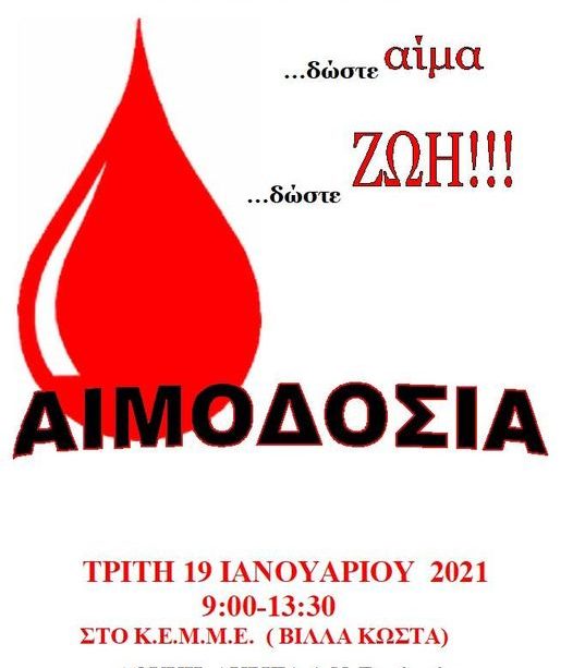 Σας προσκαλούμε στην εθελοντική αιμοδοσία του «Δρυμπέτειου Κέντρου Προαγωγής Υγείας» σε συνεργασία με το Νοσοκομείο «Αμαλία Φλέμινγκ» που θα γίνει από την Κοινωνική Μέριμνα του Δήμου μας: