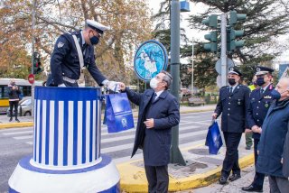 Ο Υφυπουργός Προστασίας του Πολίτη, κ. Ελευθέριος Οικονόμου, συνοδευόμενος από τον Υπαρχηγό της Ελληνικής Αστυνομίας, Αντιστράτηγο Ανδρέα Δασκαλάκη και το Διευθυντή της Διεύθυνσης Αστυνομίας Βορειοανατολικής Αττικής, Ταξίαρχο Παναγιώτη Κολλίντζα προσέφεραν δώρα σε τροχονόμο στην Κηφισιά.