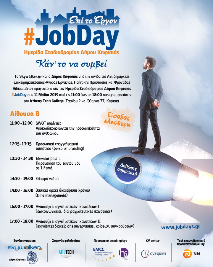 Ο Δήμος Κηφισιάς υπό την αιγίδα της Αντιδημαρχίας Επιχειρηματικότητας-Αγοράς Εργασίας, Πολιτικής Προστασίας και Φροντίδας Ηλικιωμένων, διοργανώνει για τρίτη χρονιά σε συνεργασία με το skywalker.gr την Ημερίδα Σταδιοδρομίας Δήμου Κηφισιάς#Jobday. Πρόκειται για μία δράση που περιλαμβάνει εργαστήρια αναζήτησης εργασίας και ανάπτυξης επαγγελματικών δεξιοτήτων, προσωπικό coaching και δωρεάν αξιολόγηση βιογραφικών σημειωμάτων. Επίσης, τη φετινή χρονιά θα πραγματοποιηθούν για πρώτη φορά δωρεάν τεστ επαγγελματικού προσανατολισμού.