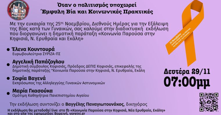 Με την ευκαιρία της 25ης Νοεμβρίου, Διεθνούς Ημέρας για την Εξάλειψη της Βίας κατά των Γυναικών, η δημοτική παράταξη «Κοινωνία Παρούσα στην Κηφισιά, Ν. Ερυθραία και Εκάλη» διοργανώνει διαδικτυακή εκδήλωση με θέμα: «Όταν ο πολιτισμός υποχωρεί : Έμφυλη Βία και Κοινωνικές Πρακτικές».