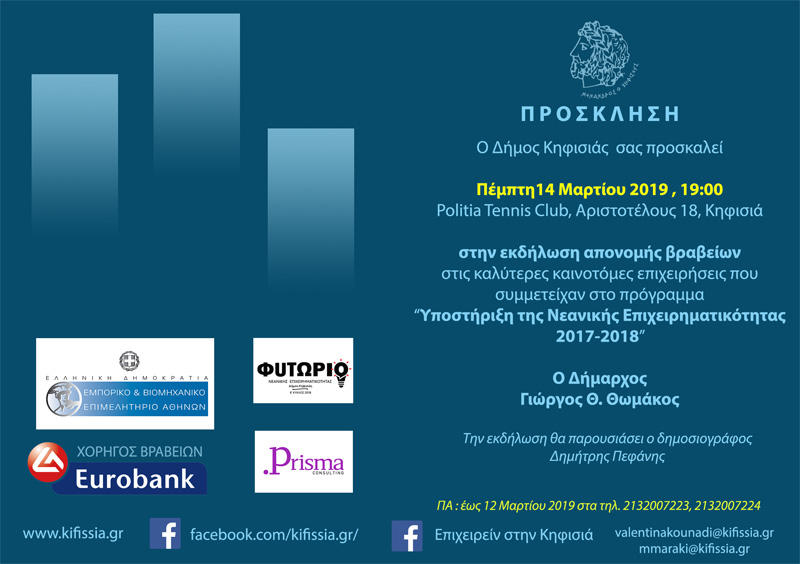 Ο Δήμος Κηφισιάς ανακοινώνει πως η προγραμματισμένη για την Δευτέρα 25 Φεβρουαρίου 2019 στις 7μμ εκδήλωση απονομής βραβείων στις καλύτερες καινοτόμες επιχειρήσεις που συμμετείχαν