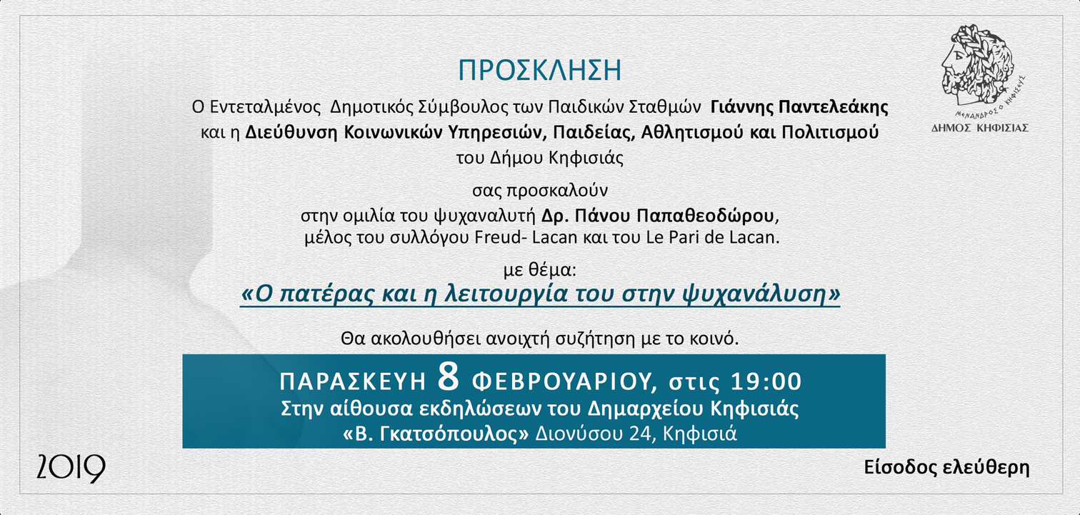 H Διεύθυνση Κοινωνικών Υπηρεσιών, Παιδείας, Αθλητισμού και Πολιτισμού του Δήμου Κηφισιάς, σας προσκαλούν στην ομιλία του ψυχαναλυτή Δρ. Πάνου Παπαθεοδώρου με θέμα:
