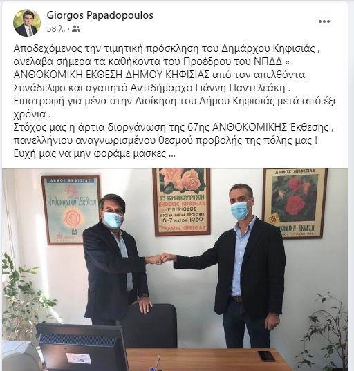 Αποδεχόμενος την τιμητική πρόσκληση του Δημάρχου Κηφισιάς , ανέλαβα σήμερα τα καθήκοντα του Προέδρου του ΝΠΔΔ « ΑΝΘΟΚΟΜΙΚΗ ΕΚΘΕΣΗ ΔΗΜΟΥ ΚΗΦΙΣΙΑΣ από τον απελθόντα Συνάδελφο και αγαπητό Αντιδήμαρχο Γιάννη Παντελεάκη . Επιστροφή για μένα στην Διοίκηση του Δήμου Κηφισιάς μετά από έξι χρόνια .