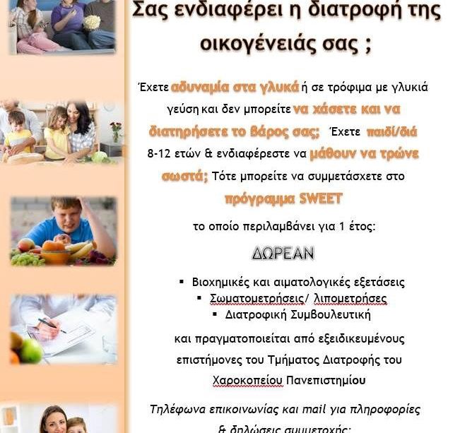 Το Χαροκόπειο Πανεπιστήμιο στο πλαίσιο του ερευνητικού και κοινωνικού του έργου και σε συνεργασία με τον Δήμο Κηφισιάς διεξάγει το πρόγραμμα προαγωγής υγείας και ρύθμισης του σωματικού βάρους «SWEET» το οποίο χρηματοδοτείται από την Ευρωπαϊκή Ένωση.