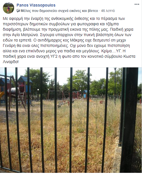 Με αφορμή την έναρξη της ανθοκομικής έκθεσης και το πέρασμα των περισσότερων δημοτικών συμβούλων για φωτογραφία και τζάμπα διαφήμιση, βλέπουμε την πραγματική εικόνα της πόλης μας. Παιδική χαρά στην Αγία Ματρώνα. Σίγουρα υπάρχουν στην πυκνή βλάστηση όλων των ειδών τα ερπετά. Ο αντιδήμαρχος κος Μακρής είχε δεσμευτεί οτι μέχρι Γενάρη θα είναι όλες πιστοποιημένες. Όχι μόνο δεν έχουμε πιστοποίηση αλλά και ένα επικίνδυνο μέρος για παιδιά και μεγάλους. Κρίμα….ΥΓ. Η παιδική χαρά είναι ανοιχτή. ΥΓ2 η φωτο από τον κοινοτικό σύμβουλο Κώστα Λιναρδο!