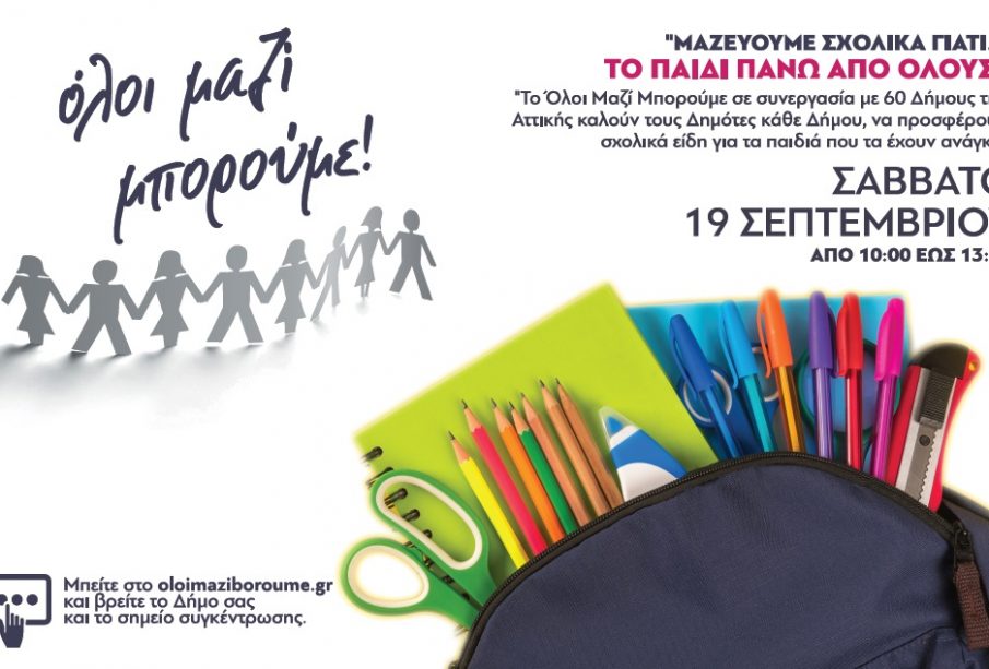 Ο Δήμος Κηφισιάς, ενώνει τις δυνάμεις τους με 60 δήμους της Αττικής και συμμετέχουν στην δράση του «Όλοι Μαζί Μπορούμε», συγκεντρώνοντας σχολικά είδη για τα παιδιά των οικογενειών που το έχουν ανάγκη, το Σάββατο 19 Σεπτεμβρίου από τις 10:00 το πρωί έως τις 13:00 το μεσημέρι.