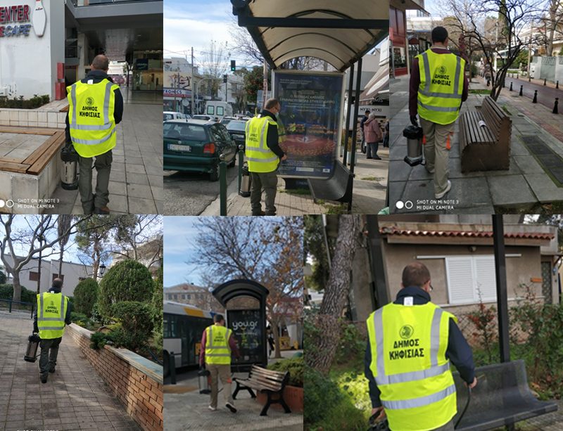 Ειδικό συνεργείο με κατάλληλο εξοπλισμό, απολυμαίνει σε εβδομαδιαία βάση στάσεις λεωφορείων, πλατείες και σημεία σε Κηφισιά, Νέα Ερυθραία και Νέα Κηφισιά όπου συγκεντρώνονται πολίτες.