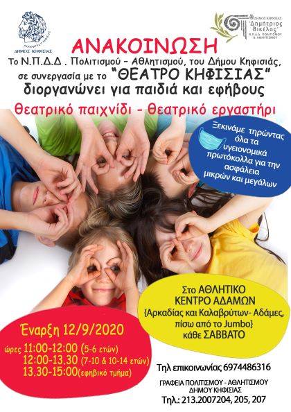 Θεατρικό παιχνίδι – θεατρικό εργαστήρι από 12/9 στον Δήμο Κηφισιάς