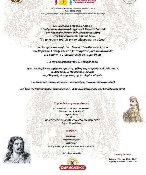 Διήμερη εκδήλωση με θέμα “Τα μηνύματα του ΄21 για το σήμερα και το αύριο” θα πραγματοποιηθεί στις 19 & 20 Ιουνίου 2021 Σάββατο και Κυριακή αντίστοιχα, στους χώρους του Ευρωπαϊκού Μουσείου Άρτου στον Βαρνάβα Αττικής και με όλα τα υγειονομικά πρωτόκολλα.