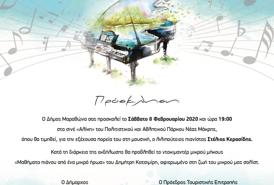 Ο ∆ήµος Μαραθώνος σας προσκαλεί το Σάββατο 8 Φεβρουαρίου 2020 και ώρα 19:00 στο Σινέ «Αλίκη» του Πολιτιστικού και Αθλητικού Πάρκου Νέας Μάκρης, όπου θα τιµηθεί, για την εξέχουσα πορεία του στη µουσική, ο λιλιπούτειος πιανίστας Στέλιος Κερασίδης.