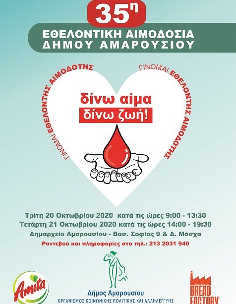 Ο Οργανισμός Κοινωνικής Πολιτικής και Αλληλεγγύης του Δήμου Αμαρουσίου (ΟΚΟΙΠΑΔΑ) διοργανώνει διήμερο Εθελοντικής Αιμοδοσίας, λαμβάνοντας για την προστασία των συμμετεχόντων στην αιμοδοσία όλα τα μέτρα πρόληψης και ασφάλειας από τη λοίμωξη covid-19, όπως προβλέπονται από τον ΕΟΔΥ.