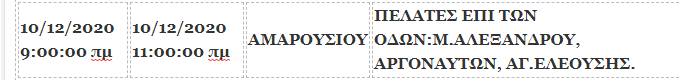 | 10/12/2020 9:00:00 πμ | 10/12/2020 11:00:00 πμ | ΑΜΑΡΟΥΣΙΟΥ | ΠΕΛΑΤΕΣ ΕΠΙ ΤΩΝ ΟΔΩΝ:Μ.ΑΛΕΞΑΝΔΡΟΥ, ΑΡΓΟΝΑΥΤΩΝ, ΑΓ.ΕΛΕΟΥΣΗΣ. | 862 | Εξυπηρέτηση τρίτων |