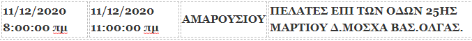 | 11/12/2020 8:00:00 πμ | 11/12/2020 11:00:00 πμ | ΑΜΑΡΟΥΣΙΟΥ | ΠΕΛΑΤΕΣ ΕΠΙ ΤΩΝ ΟΔΩΝ 25ΗΣ ΜΑΡΤΙΟΥ Δ.ΜΟΣΧΑ ΒΑΣ.ΟΛΓΑΣ. | 869 | Κατασκευές |