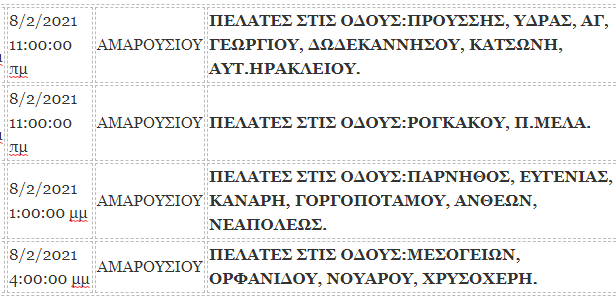 | 8/2/2021 11:00:00 πμ | 8/2/2021 1:00:00 μμ | ΑΜΑΡΟΥΣΙΟΥ | ΠΕΛΑΤΕΣ ΣΤΙΣ ΟΔΟΥΣ:ΠΑΡΝΗΘΟΣ, ΕΥΓΕΝΙΑΣ, ΚΑΝΑΡΗ, ΓΟΡΓΟΠΟΤΑΜΟΥ, ΑΝΘΕΩΝ, ΝΕΑΠΟΛΕΩΣ. | 93 | Κατασκευές |