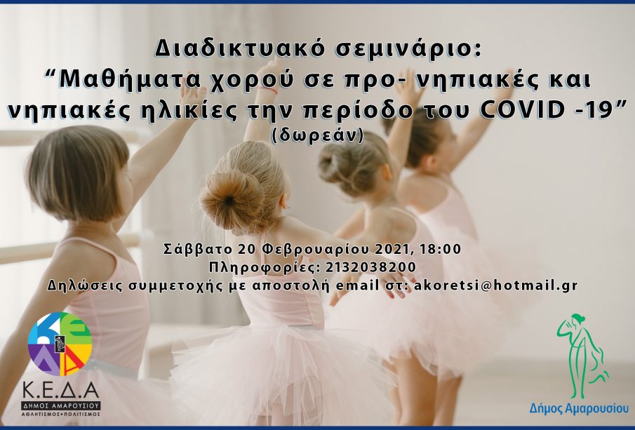 Σε συνέχεια των κατευθύνσεων που έχουν δοθεί από τον Δήμαρχο Αμαρουσίου Θεόδωρο Αμπατζόγλου προς τον Πρόεδρο της Κοινωφελούς Επιχείρησης του Δήμου (ΚΕΔΑ) Νίκο Πέππα όσο αφορά τις διαδικτυακές δράσεις του Πολιτιστικού Κέντρου του Δήμου για το 2021 ανακοινώνεται η διοργάνωση σεμιναρίου με τίτλο «Μαθήματα χορού σε προ- νηπιακές και νηπιακές ηλικίες την περίοδο του COVID -19». Το σεμινάριο απευθύνεται σε δασκάλες και δασκάλους χορού μπαλέτου, μουσικοκινητικής, χορού, σε παιδαγωγούς, σε σχολάρχες κ.α.