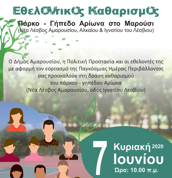 Με αφορμή την Παγκόσμια Ημέρα Περιβάλλοντος (5 Ιουνίου), ο Δήμος Αμαρουσίου, η Πολιτική Προστασία και οι Εθελοντές της, διοργανώνουν δράση καθαρισμού στο πάρκο – γήπεδο Αρίωνα, την Κυριακή 7 Ιουνίου 2020 και ώρα 10 π.μ.