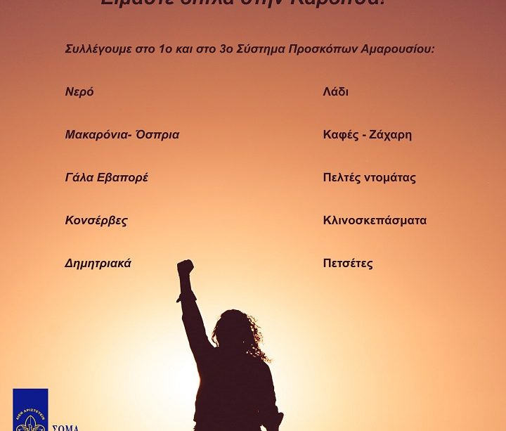 Όλη η Ελλάδα έχει ενωθεί σε μια γροθιά για να σταθεί στο πλευρό των συνανθρώπων μας στην Καρδίτσα που πλήγηκαν από τις καταστροφικές πλημμύρες. Έτσι και η προσκοπική κοινότητα του Αμαρουσίου δεν θα μπορούσε να μείνει αμέτοχη. Κάνουν πράξη την υπόσχεση τους «Να βοηθώ κάθε άνθρωπο σε κάθε περίσταση» και συλλέγουν τρόφιμα και είδη πρώτης ανάγκης. Η δράση προσφοράς είναι ανοιχτή σε όσους θέλουν να βοηθήσουν και να προσφέρουν το κατά δύναμιν.