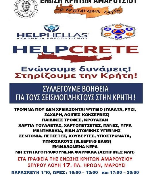 Η Ένωση Κρητών Αμαρουσίου «Ο Κρηταγενής Ζευς», συμμετέχει στη δράση αποστολής βοήθειας στους σεισμόπληκτους της Κρήτης και συγκεντρώνει υλικό στα γραφεία της Ένωσης, στη διεύθυνση Σπ. Λούη 17, πλατεία Ηρώων, Μαρούσι, σήμερα Παρασκευή 1 Οκτωβρίου, ώρες 10:00-13:00 και 17:00-20:00 και το Σάββατο 2 Οκτωβρίου, ώρες 10:00-14:00.
