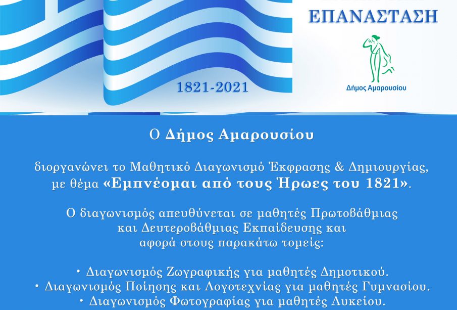 Ο Δήμος Αμαρουσίου εγκαινιάζει τις επετειακές εκδηλώσεις για τον εορτασμό των 200 χρόνων από την Ελληνική Επανάσταση, με τη διοργάνωση του Μαθητικού Διαγωνισμού με θέμα: «Εμπνέομαι από τους Ήρωες του 1821».