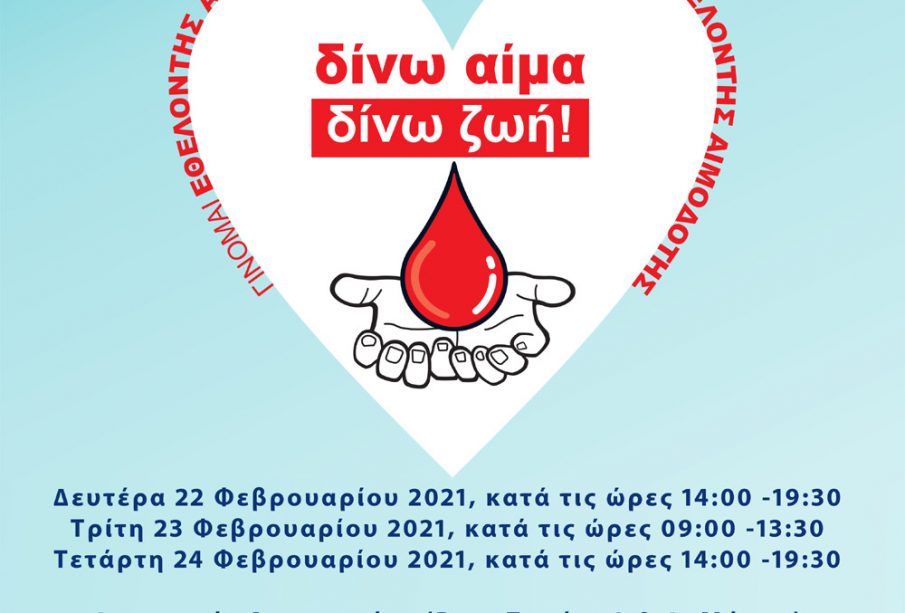 Λόγω παράτασης των δυσμενών καιρικών συνθηκών, το τριήμερο Εθελοντικής Αιμοδοσίας που διοργανώνει ο Οργανισμός Κοινωνικής Πολιτικής και Αλληλεγγύης του Δήμου Αμαρουσίου, στο Δημαρχείο Αμαρουσίου (Βασ. Σοφίας 9 & Δ. Μόσχα), μεταβάλλεται ως ακολούθως: