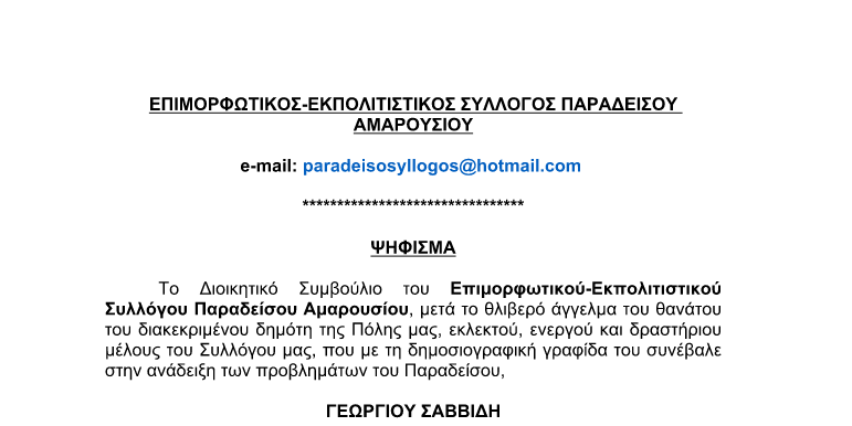 Ψήφισμα του Επιμορφωτικού-Εκπολιτιστικού Συλλόγου Παραδείσου Αμαρουσίου για την απώλεια του Γεώργιου Σαββίδη