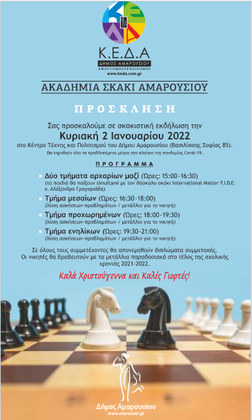 Σκακιστική εκδήλωση με τη συμμετοχή των σπουδαστών στην Ακαδημία Σκάκι της Κοινωφελούς Επιχείρησης θα διεξαχθεί στο Κέντρο Τέχνης και Πολιτισμού του Δήμου Αμαρουσίου (Βασ. Σοφίας 85), την Κυριακή 2 Ιανουαρίου 2022, με την τήρηση όλων των υγειονομικών πρωτοκόλλων.