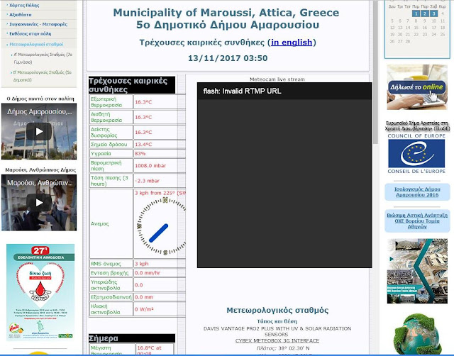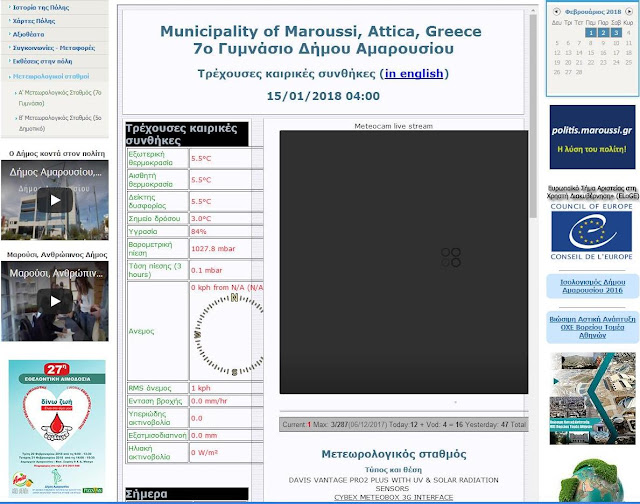 Οι δυο μετεωρολογικοί σταθμοί που εγκατέστησε ο Δήμος Αμαρουσίου, στα πλαίσια των έργων βιοκλιματικής ανάπλασης του ΑΓΙΟΥ ΘΩΜΑ, ΠΑΡΑΔΕΙΣΟΥ και ΠΟΛΥΔΡΟΣΟΥ βρίσκονται εκτός λειτουργίας, ο ένας σταθμός, που διαθέτει και κάμερα, είναι εγκατεστημένος στο 7ο Γυμνάσιο Αμαρουσίου στην οδό Σάμου και Μονεμβασίας από 15-01-2018 και ο δεύτερος που είναι εγκατεστημένος στο 5ο Δημοτικό Αμαρουσίου στην οδό Αμαρυσίας Αρτέμιδος 15 από 13-11-2017