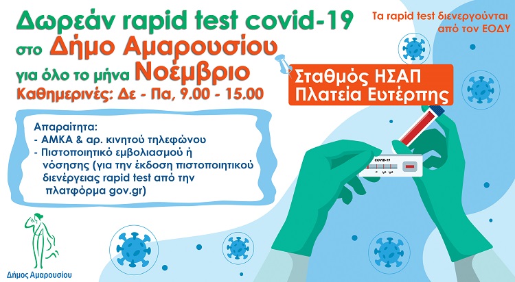 Πρόγραμμα rapid tests, Μαρούσι: Δευτέρα έως και Παρασκευή, ΗΣΑΠ – πλατεία Ευτέρπης, ώρες 9:00 – 15:00.